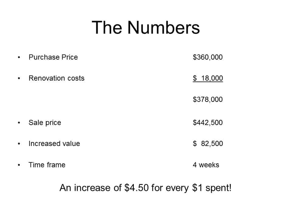 We renovated and sold this renovated home just four weeks after purchasing it. A buyer approached us with a great offer before we staged it and presented it to the public for sale. We were very happy with the result.